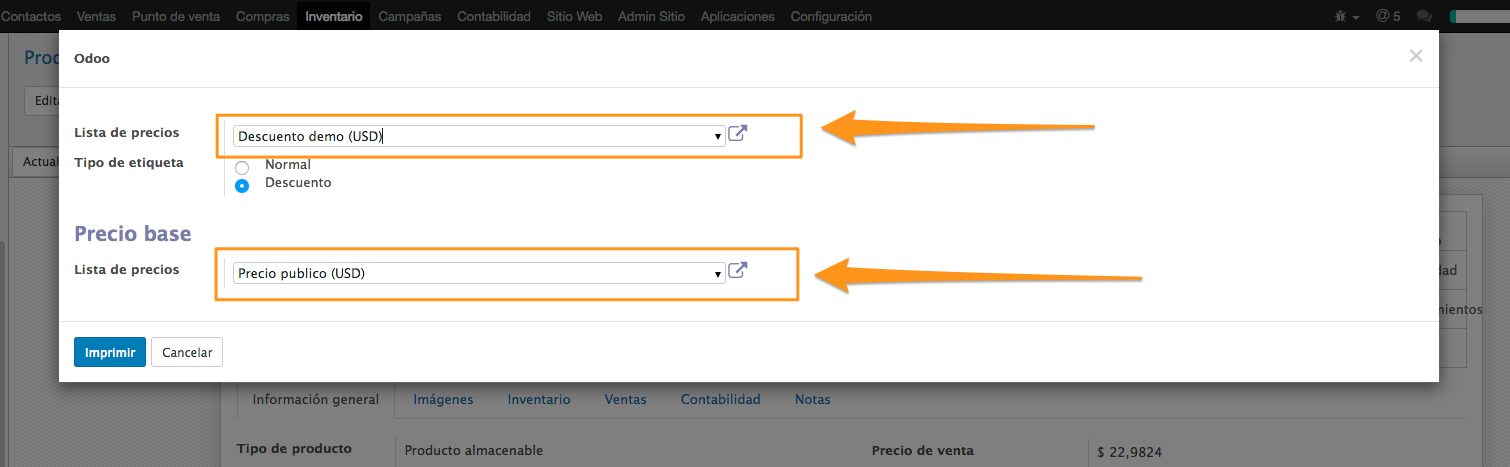 3. Luego se ingresa al modulo de inventario y se ubica el producto. Verificamos a ver como se muestra la impresión de la etiqueta. Se ingresa al modulo de “Inventario” -> “Productos” y se ubica el producto Se le da clic en el botón “Imprimir”. En el primer campo de “Lista de precio” se coloca el descuento creado anteriormente. En el segundo campo de “Lista de precios” se coloca el precio base el cual es el “Precio publico”.